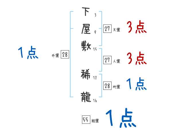 天運![]() | 下屋敷稀龍さんの天運は27画の3つ星!頭脳明晰だが強情で摩擦が多い傾向。孤立に注意。 家系が持つ宿命的な運勢を表します。祖先から受け継いだ苗字ですので自分の力が及びません。家柄を象徴します。 |