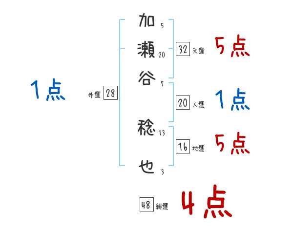 外運![]() | 加瀬谷稔也さんの外運は28画の1つ星!家庭環境に注意。スポーツで活躍できる能力があるかも。 生活面を象徴する運勢です。外部から受ける影響力を表し、結婚運、家庭運や職場、環境への順応性を表します。 |