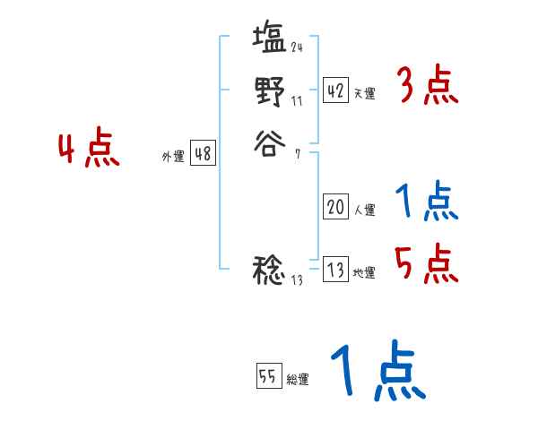 外運![]() | 塩野谷稔さんの外運は48画の4つ星!賢明な性格で人望が厚い。指導力があり多くの人に尊敬される。 生活面を象徴する運勢です。外部から受ける影響力を表し、結婚運、家庭運や職場、環境への順応性を表します。 |
