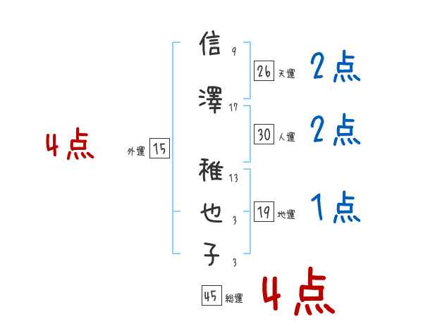 天運![]() | 信澤稚也子さんの天運は26画の2つ星!波瀾万丈かも。信頼できる人を大事にしましょう。 家系が持つ宿命的な運勢を表します。祖先から受け継いだ苗字ですので自分の力が及びません。家柄を象徴します。 |