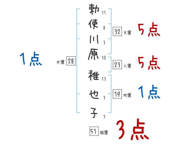 天運![]() | 勅使川原稚也子さんの天運は32画の5つ星!柔軟性があり成功する。チャンスが多く金運が良い。 家系が持つ宿命的な運勢を表します。祖先から受け継いだ苗字ですので自分の力が及びません。家柄を象徴します。 |