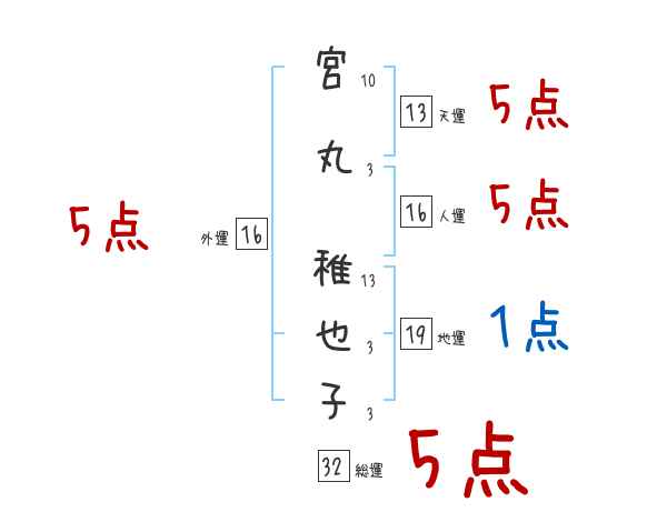 総運![]() | 宮丸稚也子さんの総運は32画の5つ星!柔軟性があり成功する。チャンスが多く金運が良い。 あなたの人生を表す1番重要な運勢です。生涯を通じて影響する総合運となり、主に50歳以降の晩年期に影響を及ぼします。 |