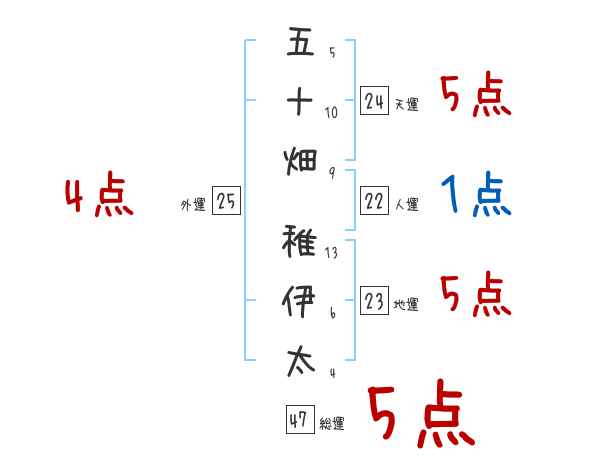 総運![]() | 五十畑稚伊太さんの総運は47画の5つ星!実力が開花し発展する円満な人生。財に恵まれる。 あなたの人生を表す1番重要な運勢です。生涯を通じて影響する総合運となり、主に50歳以降の晩年期に影響を及ぼします。 |