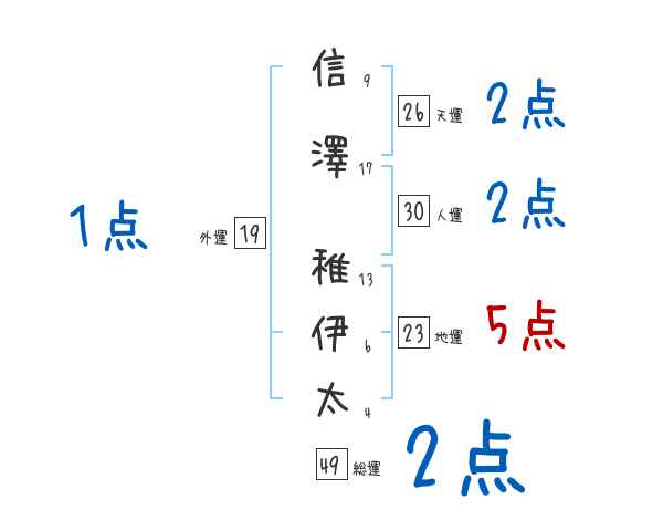 外運![]() | 信澤稚伊太さんの外運は19画の1つ星!優れた才能を持ちますが、協調性が足りないことも。周りの人と協力する事を意識しましょう。 生活面を象徴する運勢です。外部から受ける影響力を表し、結婚運、家庭運や職場、環境への順応性を表します。 |