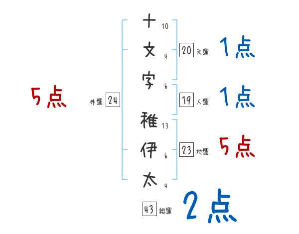 総運![]() | 十文字稚伊太さんの総運は43画の2つ星!頑固な性格で独立心が強いかも。やや非現実的で浪費に注意しましょう。 あなたの人生を表す1番重要な運勢です。生涯を通じて影響する総合運となり、主に50歳以降の晩年期に影響を及ぼします。 |