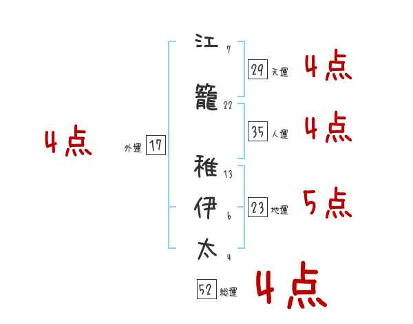 外運![]() | 江籠稚伊太さんの外運は17画の4つ星!積極的な行動力。地位を気づき財産を手に入れる。純粋な心と直感力。 生活面を象徴する運勢です。外部から受ける影響力を表し、結婚運、家庭運や職場、環境への順応性を表します。 |