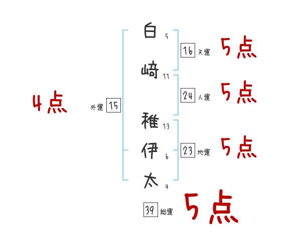 外運![]() | 白﨑稚伊太さんの外運は15画の4つ星!人徳があり出世する。順調に物事を進め円満な人生。 生活面を象徴する運勢です。外部から受ける影響力を表し、結婚運、家庭運や職場、環境への順応性を表します。 |