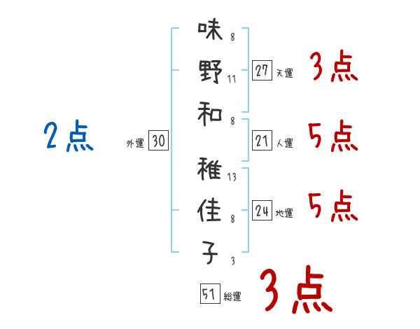 総運![]() | 味野和稚佳子さんの総運は51画の3つ星!変化が激しく、危険に注意。堅実な性格。 あなたの人生を表す1番重要な運勢です。生涯を通じて影響する総合運となり、主に50歳以降の晩年期に影響を及ぼします。 |