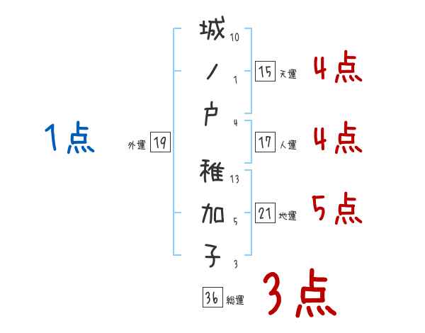 総運![]() | 城ノ戸稚加子さんの総運は36画の3つ星!先見性が豊かです。多少神経質で苦労することも。 あなたの人生を表す1番重要な運勢です。生涯を通じて影響する総合運となり、主に50歳以降の晩年期に影響を及ぼします。 |