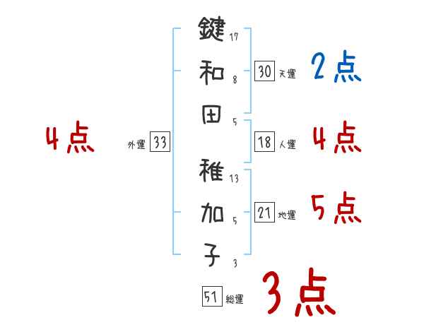 天運![]() | 鍵和田稚加子さんの天運は30画の2つ星!浮き沈みの激しさに注意しましょう。 家系が持つ宿命的な運勢を表します。祖先から受け継いだ苗字ですので自分の力が及びません。家柄を象徴します。 |