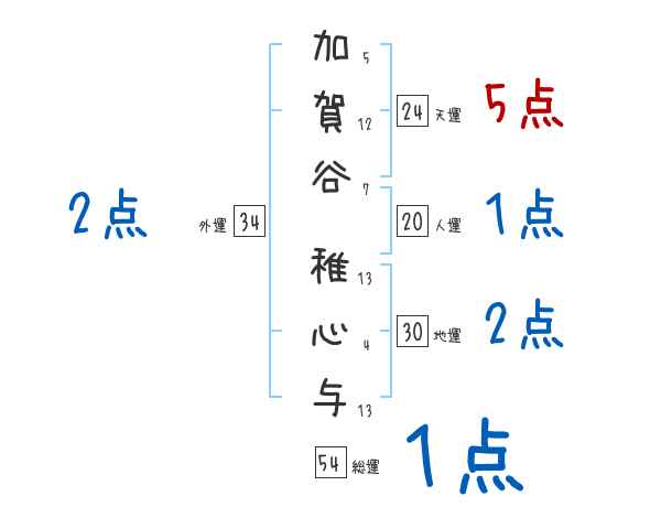 天運![]() | 加賀谷稚心与さんの天運は24画の5つ星!家庭運が良く順調な人生。金運にも恵まれる。 家系が持つ宿命的な運勢を表します。祖先から受け継いだ苗字ですので自分の力が及びません。家柄を象徴します。 |
