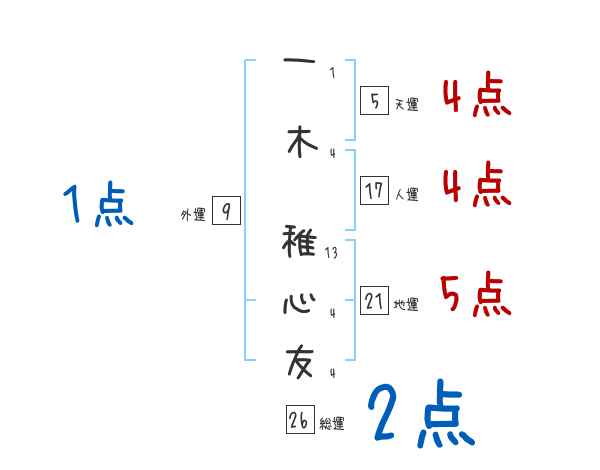 天運![]() | 一木稚心友さんの天運は5画の4つ星!健康で安泰。協調性に優れ、財産に恵まれる。 家系が持つ宿命的な運勢を表します。祖先から受け継いだ苗字ですので自分の力が及びません。家柄を象徴します。 |