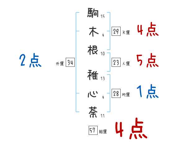 総運![]() | 駒木根稚心荼さんの総運は57画の4つ星!向上心があり人望がある。地位を得る。 あなたの人生を表す1番重要な運勢です。生涯を通じて影響する総合運となり、主に50歳以降の晩年期に影響を及ぼします。 |