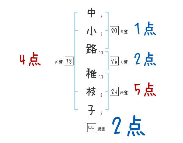 総運![]() | 中小路稚枝子さんの総運は44画の2つ星!誠実で慎重な性格。物事を考えすぎないように注意しましょう。 あなたの人生を表す1番重要な運勢です。生涯を通じて影響する総合運となり、主に50歳以降の晩年期に影響を及ぼします。 |