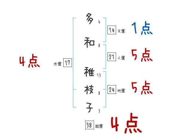外運![]() | 多和稚枝子さんの外運は17画の4つ星!積極的な行動力。地位を気づき財産を手に入れる。純粋な心と直感力。 生活面を象徴する運勢です。外部から受ける影響力を表し、結婚運、家庭運や職場、環境への順応性を表します。 |
