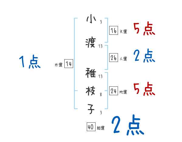 天運![]() | 小渡稚枝子さんの天運は16画の5つ星!人望が厚く大きく発展する。逆転成功が見える。 家系が持つ宿命的な運勢を表します。祖先から受け継いだ苗字ですので自分の力が及びません。家柄を象徴します。 |