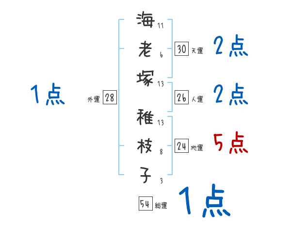 天運![]() | 海老塚稚枝子さんの天運は30画の2つ星!浮き沈みの激しさに注意しましょう。 家系が持つ宿命的な運勢を表します。祖先から受け継いだ苗字ですので自分の力が及びません。家柄を象徴します。 |