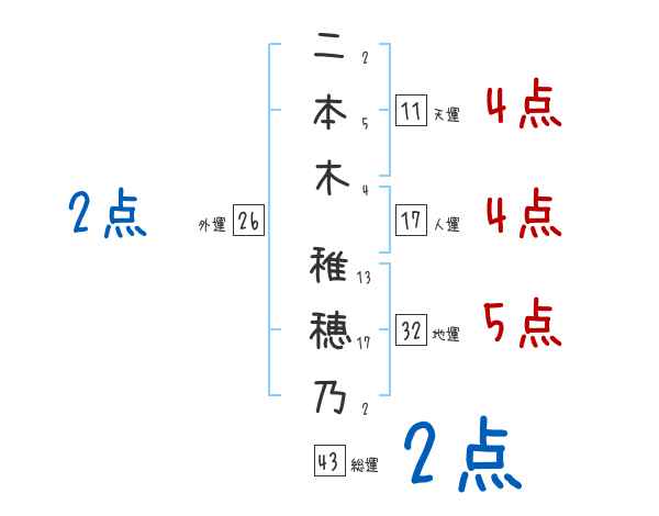 総運![]() | 二本木稚穂乃さんの総運は43画の2つ星!頑固な性格で独立心が強いかも。やや非現実的で浪費に注意しましょう。 あなたの人生を表す1番重要な運勢です。生涯を通じて影響する総合運となり、主に50歳以降の晩年期に影響を及ぼします。 |