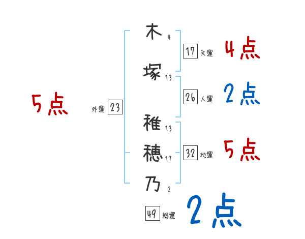 外運![]() | 木塚稚穂乃さんの外運は23画の5つ星!想像力に優れ活力がある。一代で成功し名誉を手に入れる。 生活面を象徴する運勢です。外部から受ける影響力を表し、結婚運、家庭運や職場、環境への順応性を表します。 |