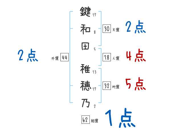 地運![]() | 鍵和田稚穂乃さんの地運は32画の5つ星!柔軟性があり成功する。チャンスが多く金運が良い。 個性を表す基礎的な運勢です。性格形成や対人関係、行動力など家庭環境に影響されます。主に誕生してから20歳くらいまでの若年期の運勢を表します。 |