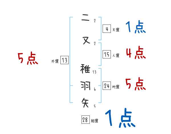 天運![]() | 二又稚羽矢さんの天運は4画の1つ星!感情が不安定で苦労するかも。周囲との協調を心掛けましょう。 家系が持つ宿命的な運勢を表します。祖先から受け継いだ苗字ですので自分の力が及びません。家柄を象徴します。 |