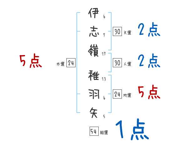 伊志嶺稚羽矢さんの画数の鑑定結果