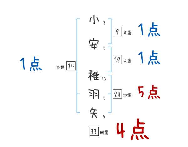 天運![]() | 小安稚羽矢さんの天運は9画の1つ星!消極的で才能を発揮することが苦手なことも。周りの意見に耳を傾けましょう。 家系が持つ宿命的な運勢を表します。祖先から受け継いだ苗字ですので自分の力が及びません。家柄を象徴します。 |