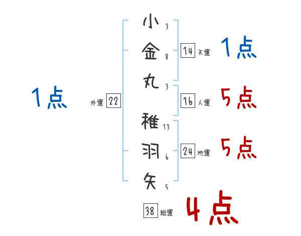 外運![]() | 小金丸稚羽矢さんの外運は22画の1つ星!努力することが苦手ないっぽう手先が器用。芸術性にも優れる。 生活面を象徴する運勢です。外部から受ける影響力を表し、結婚運、家庭運や職場、環境への順応性を表します。 |