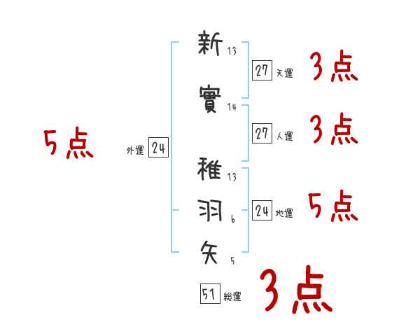 外運![]() | 新實稚羽矢さんの外運は24画の5つ星!家庭運が良く順調な人生。金運にも恵まれる。 生活面を象徴する運勢です。外部から受ける影響力を表し、結婚運、家庭運や職場、環境への順応性を表します。 |
