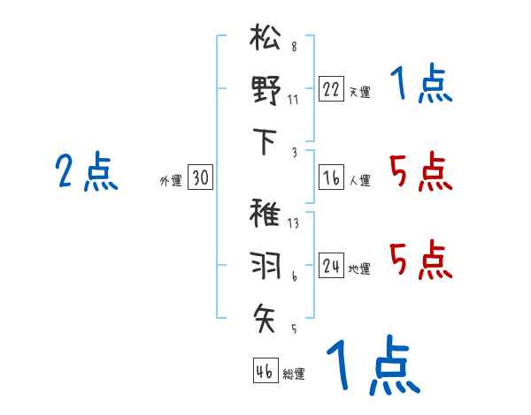 外運![]() | 松野下稚羽矢さんの外運は30画の2つ星!浮き沈みの激しさに注意しましょう。 生活面を象徴する運勢です。外部から受ける影響力を表し、結婚運、家庭運や職場、環境への順応性を表します。 |