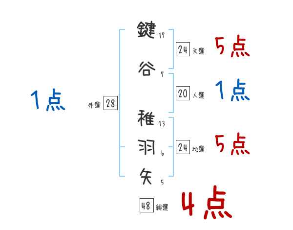 天運![]() | 鍵谷稚羽矢さんの天運は24画の5つ星!家庭運が良く順調な人生。金運にも恵まれる。 家系が持つ宿命的な運勢を表します。祖先から受け継いだ苗字ですので自分の力が及びません。家柄を象徴します。 |