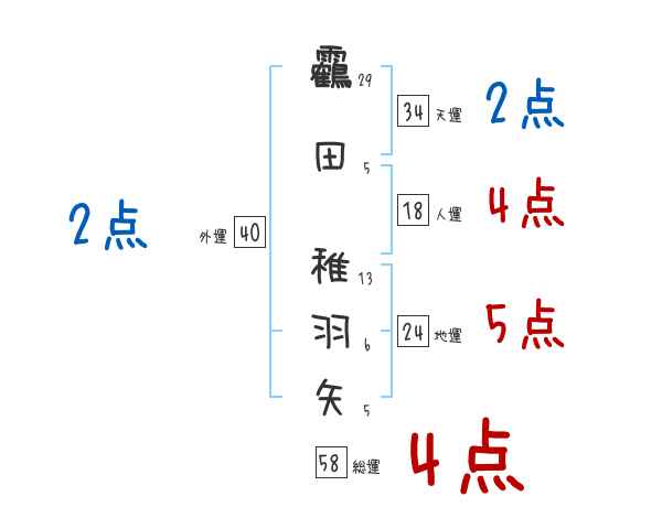外運![]() | 靏田稚羽矢さんの外運は40画の2つ星!自信過剰で物事に固執するためトラブルに注意。 生活面を象徴する運勢です。外部から受ける影響力を表し、結婚運、家庭運や職場、環境への順応性を表します。 |
