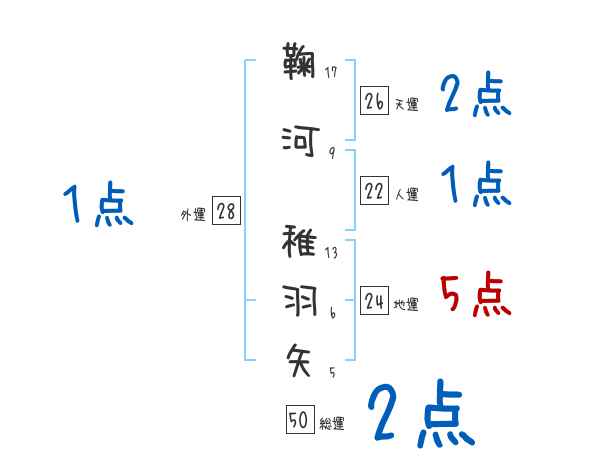 天運![]() | 鞠河稚羽矢さんの天運は26画の2つ星!波瀾万丈かも。信頼できる人を大事にしましょう。 家系が持つ宿命的な運勢を表します。祖先から受け継いだ苗字ですので自分の力が及びません。家柄を象徴します。 |