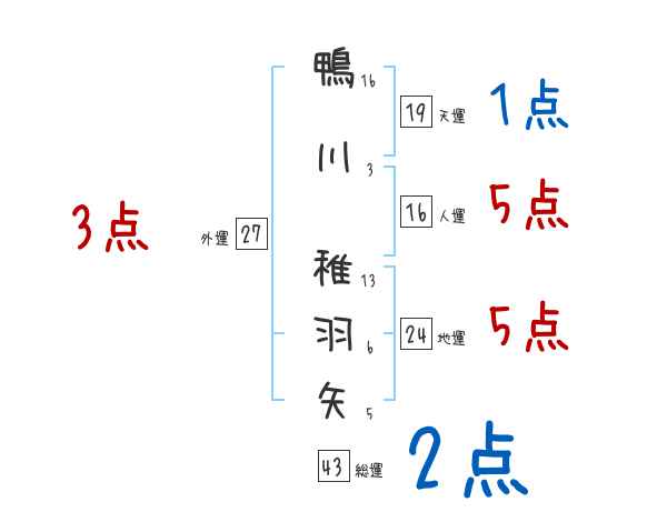 外運![]() | 鴨川稚羽矢さんの外運は27画の3つ星!頭脳明晰だが強情で摩擦が多い傾向。孤立に注意。 生活面を象徴する運勢です。外部から受ける影響力を表し、結婚運、家庭運や職場、環境への順応性を表します。 |
