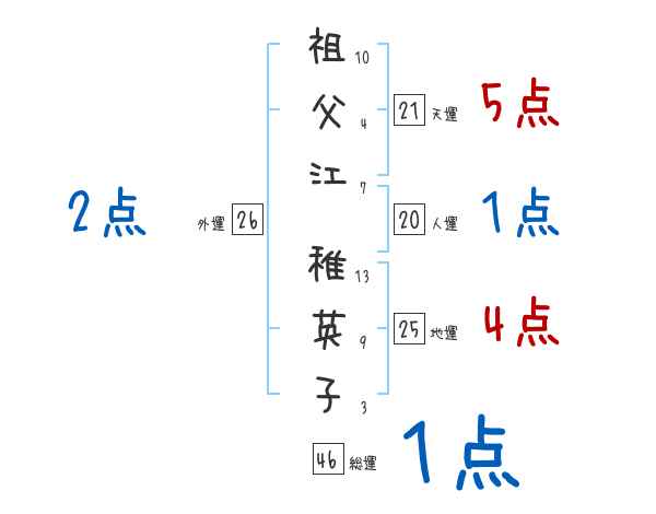 天運![]() | 祖父江稚英子さんの天運は21画の5つ星!統率力がある。独立し成功する。名誉を手に入れる。 家系が持つ宿命的な運勢を表します。祖先から受け継いだ苗字ですので自分の力が及びません。家柄を象徴します。 |
