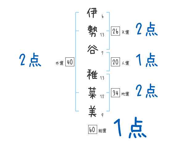 天運![]() | 伊勢谷稚菜美さんの天運は26画の2つ星!波瀾万丈かも。信頼できる人を大事にしましょう。 家系が持つ宿命的な運勢を表します。祖先から受け継いだ苗字ですので自分の力が及びません。家柄を象徴します。 |