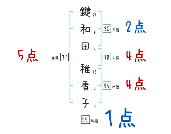 天運![]() | 鍵和田稚香子さんの天運は30画の2つ星!浮き沈みの激しさに注意しましょう。 家系が持つ宿命的な運勢を表します。祖先から受け継いだ苗字ですので自分の力が及びません。家柄を象徴します。 |