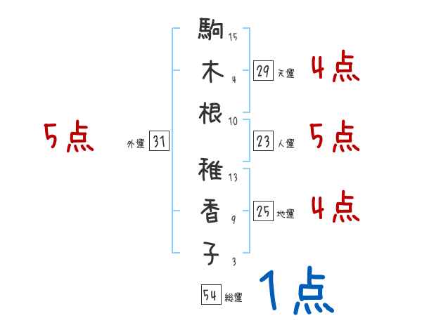 総運![]() | 駒木根稚香子さんの総運は54画の1つ星!トラブルが多いかも。周りをよく見て協調して過ごしましょう。 あなたの人生を表す1番重要な運勢です。生涯を通じて影響する総合運となり、主に50歳以降の晩年期に影響を及ぼします。 |