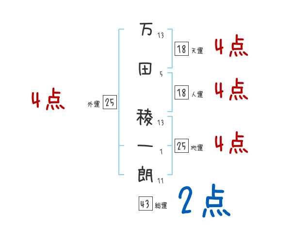 天運![]() | 万田稜一朗さんの天運は18画の4つ星!情熱的で剛気。忍耐力があり信頼される。 家系が持つ宿命的な運勢を表します。祖先から受け継いだ苗字ですので自分の力が及びません。家柄を象徴します。 |