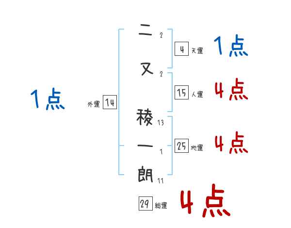 天運![]() | 二又稜一朗さんの天運は4画の1つ星!感情が不安定で苦労するかも。周囲との協調を心掛けましょう。 家系が持つ宿命的な運勢を表します。祖先から受け継いだ苗字ですので自分の力が及びません。家柄を象徴します。 |