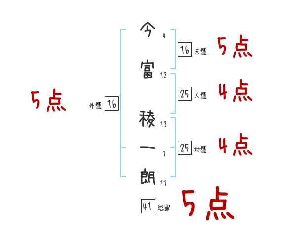 天運![]() | 今富稜一朗さんの天運は16画の5つ星!人望が厚く大きく発展する。逆転成功が見える。 家系が持つ宿命的な運勢を表します。祖先から受け継いだ苗字ですので自分の力が及びません。家柄を象徴します。 |