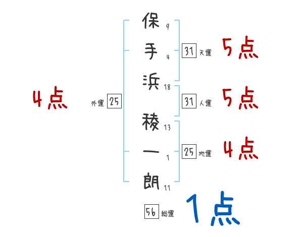 外運![]() | 保手浜稜一朗さんの外運は25画の4つ星!個性があり才能があふれる。強運の持ち主で発展する。 生活面を象徴する運勢です。外部から受ける影響力を表し、結婚運、家庭運や職場、環境への順応性を表します。 |