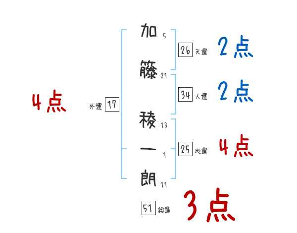 外運![]() | 加籐稜一朗さんの外運は17画の4つ星!積極的な行動力。地位を気づき財産を手に入れる。純粋な心と直感力。 生活面を象徴する運勢です。外部から受ける影響力を表し、結婚運、家庭運や職場、環境への順応性を表します。 |