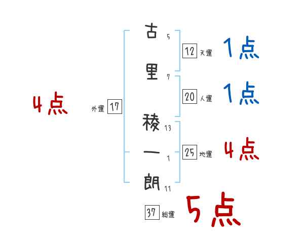天運![]() | 古里稜一朗さんの天運は12画の1つ星!簡単な失敗で諦めてしまいやすいかも。着実に行動すると良いでしょう。 家系が持つ宿命的な運勢を表します。祖先から受け継いだ苗字ですので自分の力が及びません。家柄を象徴します。 |