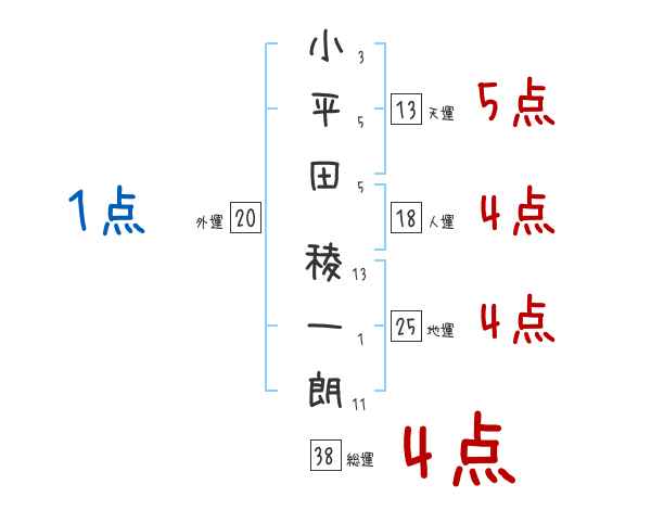 総運![]() | 小平田稜一朗さんの総運は38画の4つ星!温厚な性格で技術的な才能を発揮する。職人的な仕事に向いている。 あなたの人生を表す1番重要な運勢です。生涯を通じて影響する総合運となり、主に50歳以降の晩年期に影響を及ぼします。 |