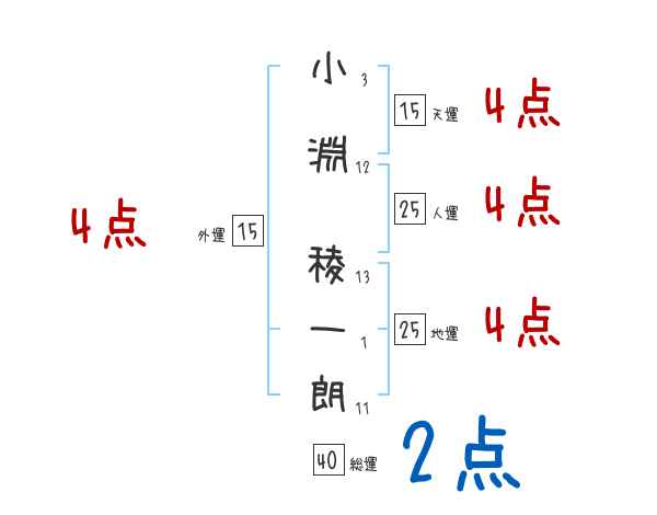 天運![]() | 小淵稜一朗さんの天運は15画の4つ星!人徳があり出世する。順調に物事を進め円満な人生。 家系が持つ宿命的な運勢を表します。祖先から受け継いだ苗字ですので自分の力が及びません。家柄を象徴します。 |
