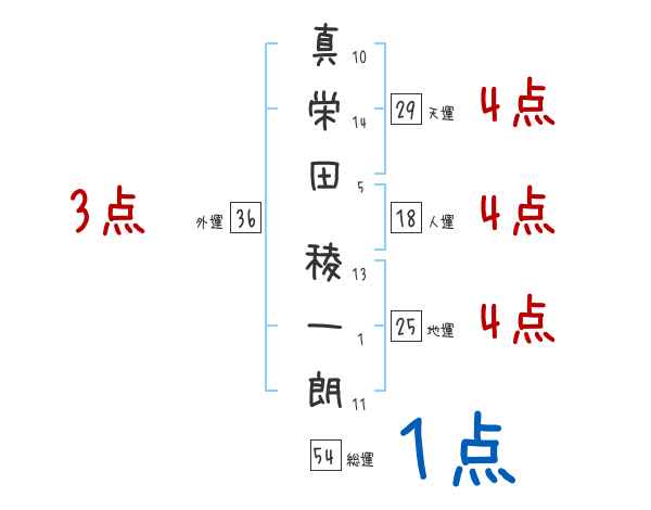 外運![]() | 真栄田稜一朗さんの外運は36画の3つ星!先見性が豊かです。多少神経質で苦労することも。 生活面を象徴する運勢です。外部から受ける影響力を表し、結婚運、家庭運や職場、環境への順応性を表します。 |
