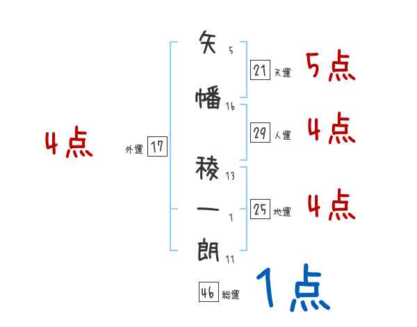 天運![]() | 矢幡稜一朗さんの天運は21画の5つ星!統率力がある。独立し成功する。名誉を手に入れる。 家系が持つ宿命的な運勢を表します。祖先から受け継いだ苗字ですので自分の力が及びません。家柄を象徴します。 |