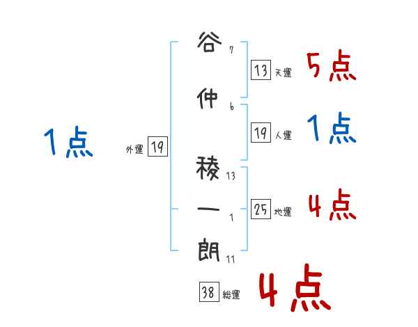 天運![]() | 谷仲稜一朗さんの天運は13画の5つ星!才能に恵まれ人気がある。名声を手に入れる。円満な人生。 家系が持つ宿命的な運勢を表します。祖先から受け継いだ苗字ですので自分の力が及びません。家柄を象徴します。 |
