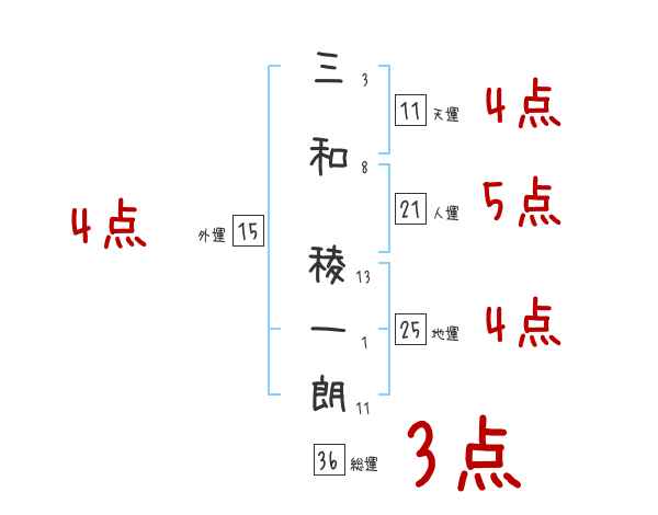 天運![]() | 三和稜一朗さんの天運は11画の4つ星!着実に富や地位を得る幸運な人生。 家系が持つ宿命的な運勢を表します。祖先から受け継いだ苗字ですので自分の力が及びません。家柄を象徴します。 |